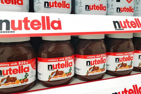 Nowy Sacz, Poland - February 21, 2020 : Various of Nutella product displayed at supermarket. Nutella is the brand of the Italian company Ferrero.