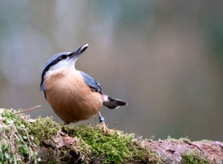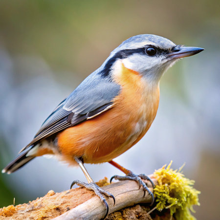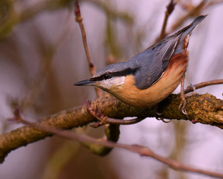 Eurasian nuthatch or wood nuthatch, lat. Sitta europaea, sitting on a tree branch with a blurred background. Gray and Orange colored small bird with a black eyestripe.