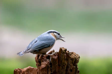 Eurasian Nuthatch (Sitta europaea) on a branch in the forest of Noord Brabant in the Netherlands. Green background with writing space.