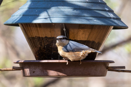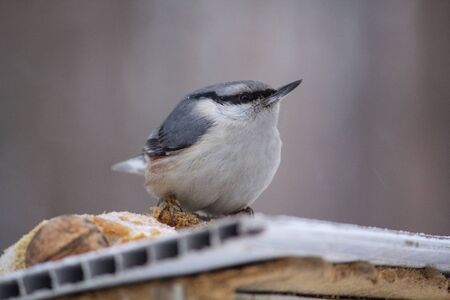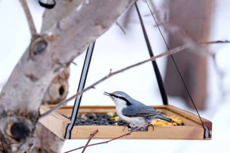 Nuthatch sits on a manger in a winter park. Birds
