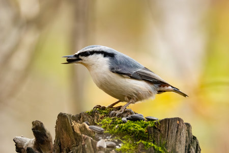 Nuthatch on a stump with sunflower seeds in its beak