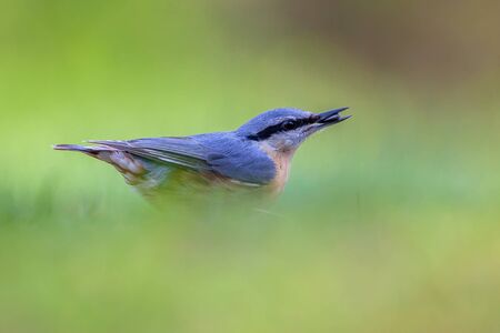 Eurasian nuthatch (Sitta europaea) feeding on seeds on the ground in an ecological garden with bright green background