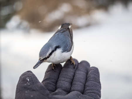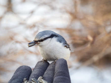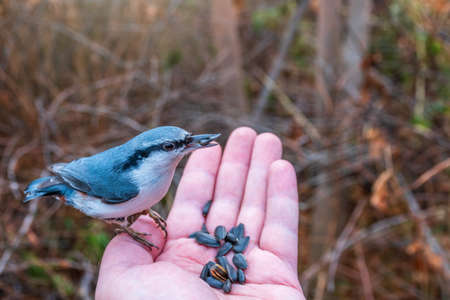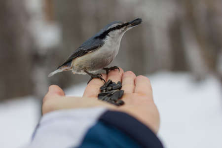 The Eurasian nuthatch eats seeds from a palm. Hungry bird wood nuthatch eating seeds from a hand during winter or autumn. Caring for animals in winter or autumn.