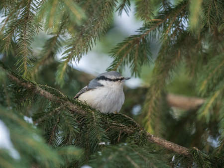 Eurasian nuthatch or wood nuthatch, lat. Sitta europaea, sitting on the fir branch in the forest. Gray and Orange colored small bird with a black eyestripe.