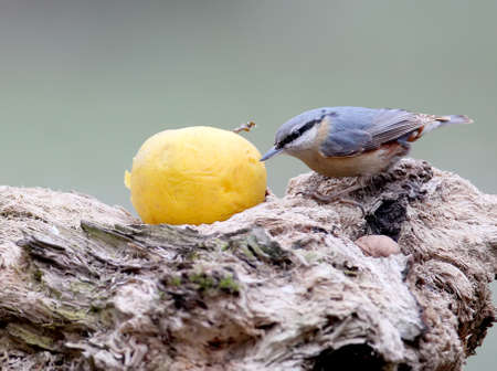 An eurasian huthatch sits on forest feeder with large yellow apple