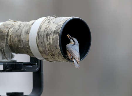 Eurasian nuthatch with a wallnut in his beak sits in a camers lens.
