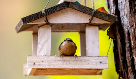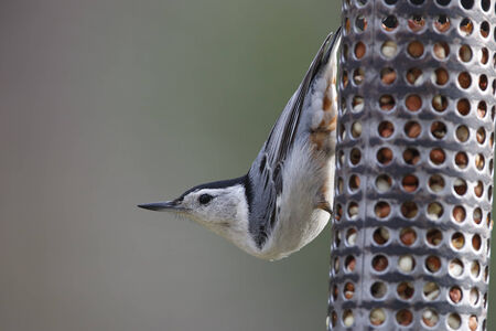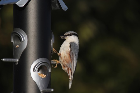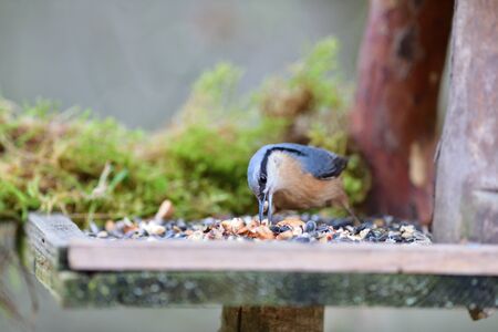 Eurasian nuthatch, Sitta europaea, feeding on sunflower seeds from a man-made birdfeeder.