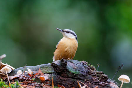 Close up of Eurasian nuthatch or wood nuthatch (Sitta Europaea) perched on forest floor with autumn leaves and looking upward