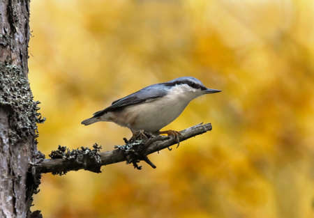 Eurasian nuthatch or wood nuthatch (Sitta europaea) sitting on a branch in fall.