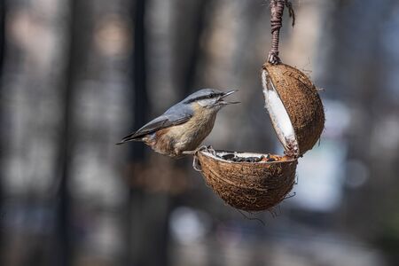 Nuthatch, observed at a feeder heart feeding in the forest. Small gray and white bird. Animal photo from nature