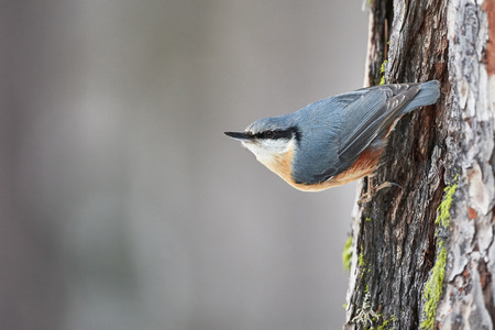 European Nuthatch clings to a trunk of larch