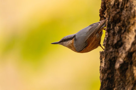 A detailed closeup shot of a nuthatch perched on a tree trunk against a blurred yellow background.