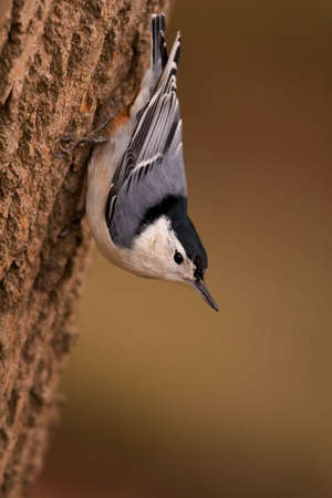 White Breasted Nuthatch clinging upside down to the side of a tree - Sitta carolinensis