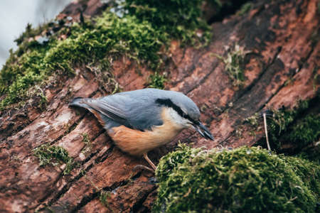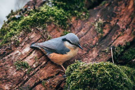 Nuthatch sitting on a tree trunk with moss in the forest.