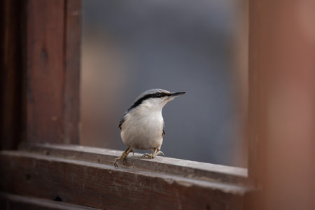 Close-up of a nuthatch perched on a wooden window ledge, captured in natural daylight. The bird's sharp eye and beak stand out against a softly blurred background, evoking calm and curiosity.