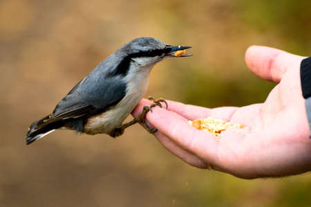 The photo shows a bird nuthatch eats seeds from the hand