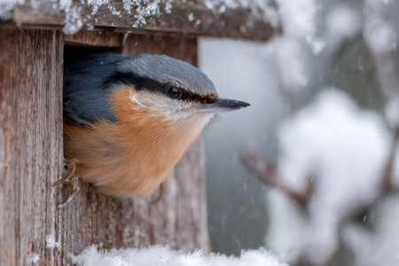 Eurasian nuthatch looking out from a wooden birdhouse while snow is falling