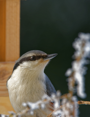 Nuthatch, small garden and woodland bird. Scientific name: Sitta, perched on a bird feeding table and looking to the right with head and beak pointing up. Dark green background. Horizontal.