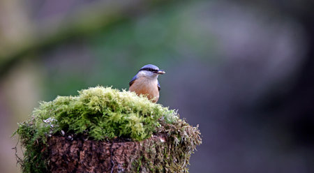 Nuthatch sitting on a tree trunk with moss in the forest.