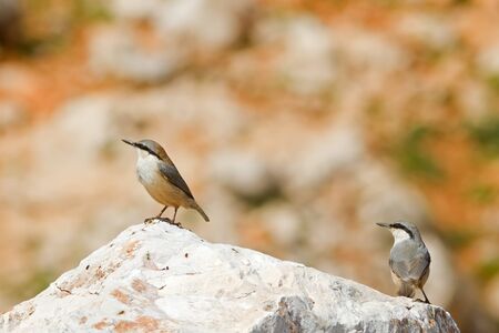 Two Western Rock Nuthatches standing on the top of a rock
