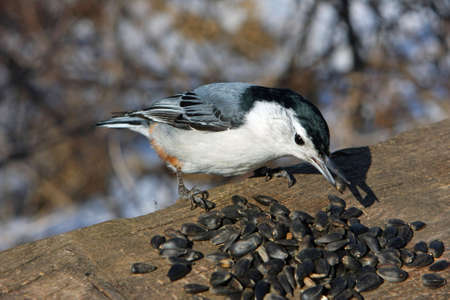 European Nuthatch eating sunflower seeds, shallow depth of field