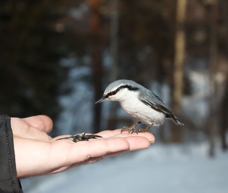 Nuthatch (Sitta europea) is sitting on the hand, Tomsk