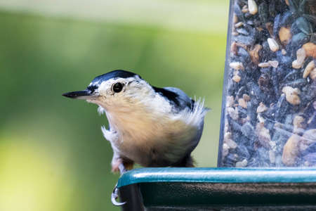Eurasian nuthatch (Sitta europaea) sitting on a bird feeder against an unfocused green background. SpainEurasian nuthatch (Sitta europaea) sitting on a bird feeder. Spain