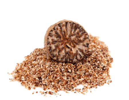 Whole and gratified nutmeg isolated on white background. A spice obtained from the seeds of the nutmeg tree