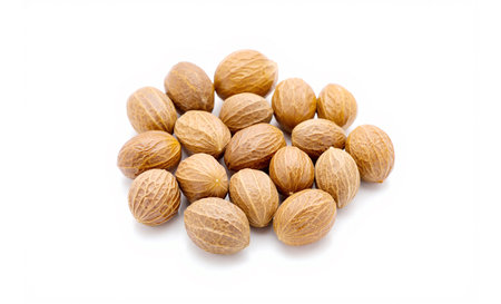 Closeup of Nutmeg, Myristica fragrans, against white background