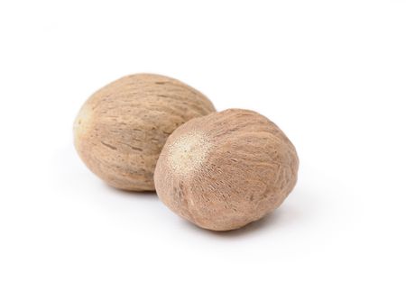 Nutmeg isolated on white background. A spice obtained from the seeds of the nutmeg tree