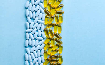Blister package with fish oil capsules on color background. Medicine pills on a light background. Medicines and prescription pills flat lay background. Yellow medical tablets in blister.