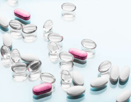 Pills and capsules on a white background. Close-up.
