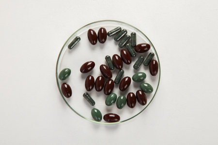 Various colorful pills in petri dish isolated on white, top view. Healthcare support. Pharmacy lab and pharmaceutical research concept.