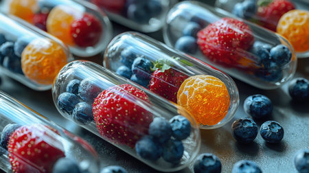 Colorful gel capsules filled tiny fruits like strawberries, blueberries, and oranges are arranged on surface, representing concept of natural vitamins in playful way