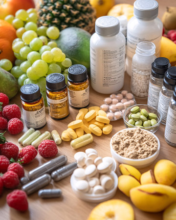 Vibrant display of fresh fruits and a bottle of pills representing health, wellness, and nutrition. Perfect for concepts related to dietary choices and healthy living.