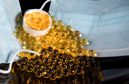 Yellow food supplement oil filled capsules on white plate and medical mask. Black background with reflection.