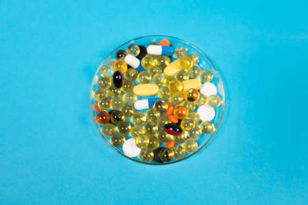 Colorful medicine pills and capsules on blue background.