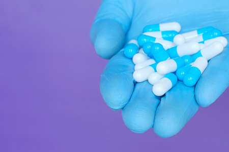 A hand with blue latex gloves grabbing hand full of medicines, Capsules for Vitamines,drugs,medication. Health,business concept