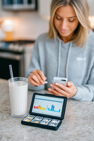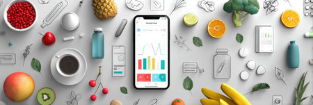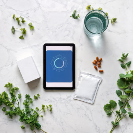 Health and technology flat lay. A tablet with a health app is surrounded by supplements, herbs, and a glass of water on a marble background.