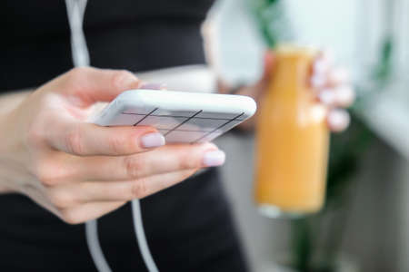 Young woman using application on smartphone when controlling her weight and consumed and burned calories