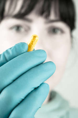 Female scientist in a laboratory holding a glass bottle containing orange capsules. She is wearing blue gloves and a white lab coat, focusing on the contents.
