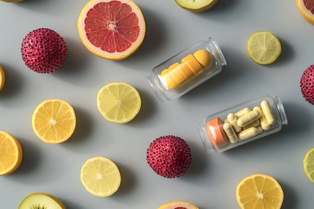 Glass jars with vitamin pills and nutritional supplements are surrounded by colorful fresh fruit slices, promoting a healthy lifestyle rich in essential nutrients