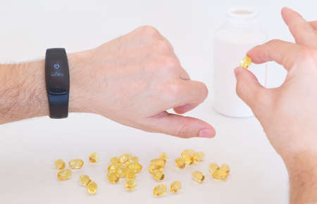 Man looking at the smart band and take an omega 3 capsule for the heart. White background.