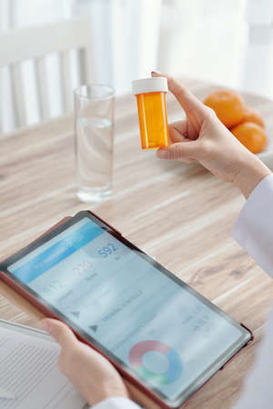 Woman checking the result of medical tests on a digital tablet, close-up with nutritional supplements on the background. Concept of individual online selection of food supplements