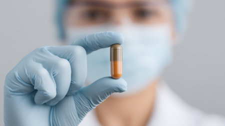 A healthcare professional wearing a surgical mask and gloves holds a capsule pill, symbolizing the importance of medication safety and pharmaceutical care in health settings.