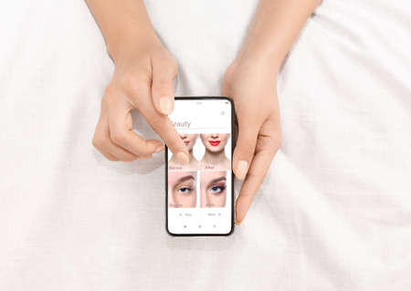 Augmented Reality Beauty App. Woman Trying Different Makeup Online