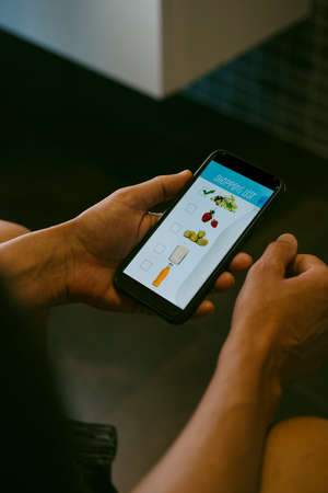 grocery online shopping. Fresh organic vegetables and fruits on wood table and mobile phone in hand for collect order online, green grocery delivery concept, top view, flat lay, closeup