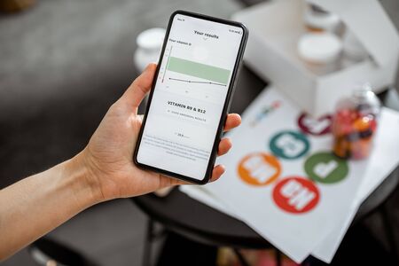 Woman checking the result of medical tests on a smartphone, close-up with nutritional supplements on the background. Concept of individual online selection of food supplements