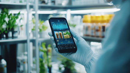 A scientist in a laboratory is using a mobile application to track plant growth and analyze data, showcasing modern technology in botanical research and environmental science.