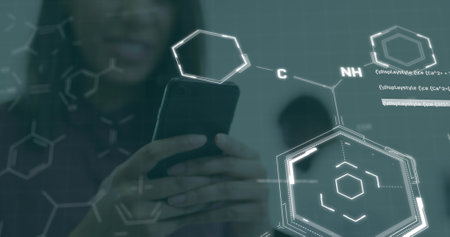 Image of chemical formulas over girl using smartphone. Global science, connections, data processing and digital interface concept digitally generated image.